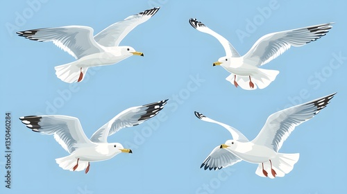 Obraz premium Professional Set of White Gull Cartoons Flying in Atlantic Sea Sky Scene