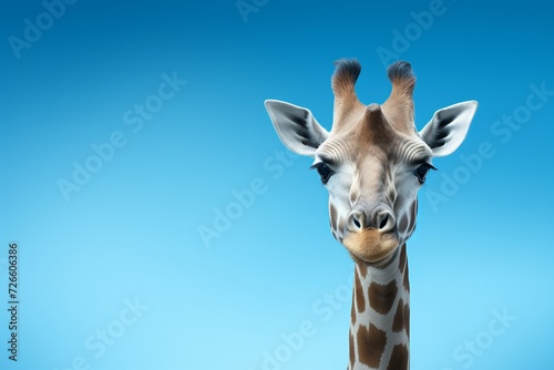 Fototapeta premium Professional studio image of a giraffe against vibrant blue backdrop with space for custom text