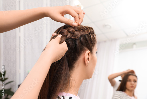 Fototapeta premium Professional stylist braiding client's hair in salon