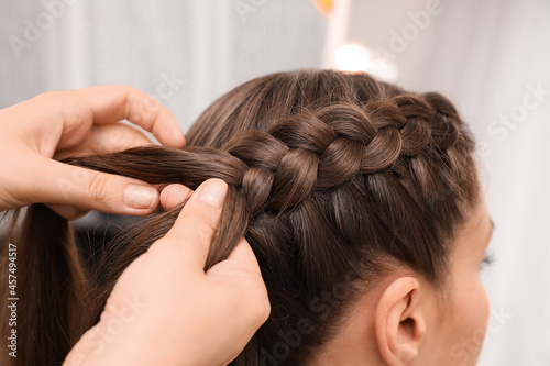 Naklejka premium Professional stylist braiding client's hair in salon, closeup