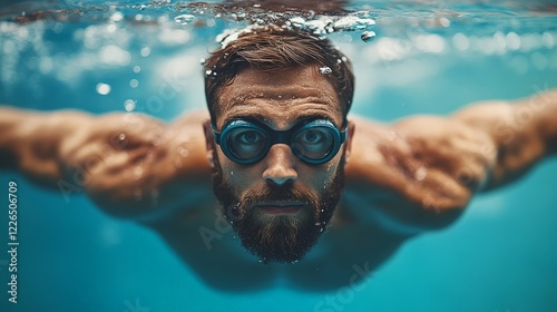 © gen_pick, Fototapeta premium Professional swimmer mid-butterfly stroke in a pool. Energetic and dynamic image suitable for sportswear, competitions, or fitness promotions.