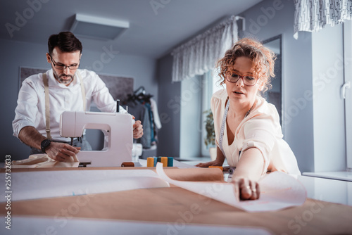 © leszekglasner, Obraz premium Professional tailors during work on project using sewing machine at fashion design studio