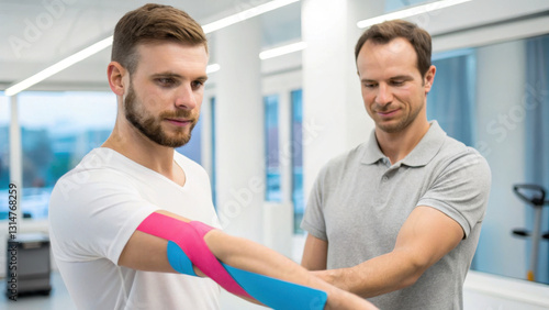 © Eing, Obraz premium professional therapist applying kinesiology tape on patient arm, showcasing therapeutic environment. focus is on rehabilitation and physical therapy techniques
