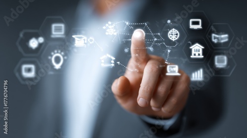Fototapeta premium Professional touching virtual screen education icons learning development digital technology interface