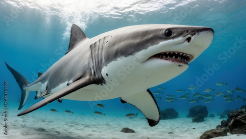 Naklejka premium Professional underwater shot of a great white shark. Highlights its size and elegance, with soft light and blurred background. Ideal for wildlife photography.