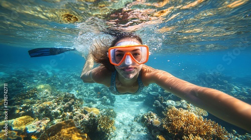 Fototapeta premium Professional Underwater Snorkeling Portrait of Young Woman for Advertising and Marketing Campaigns