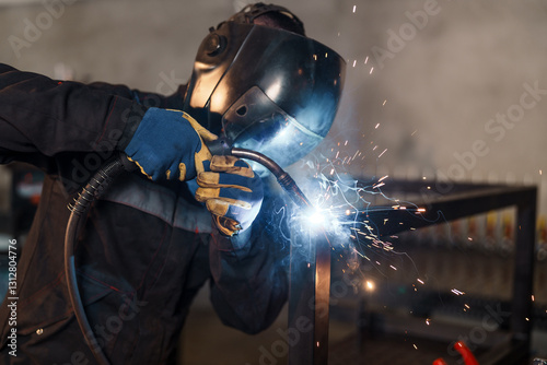 Naklejka premium Professional welder in protective gear joining metal profiles with migmag welding, generating bright sparks and smoke in an industrial workshop