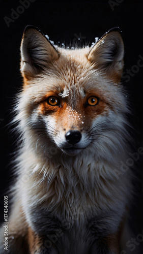 Fototapeta premium Professional winter photography of a snow fox covered in snowflakes on its fur set against a dark dramatic background