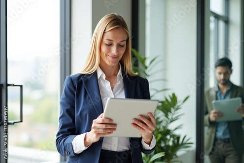 Fototapeta premium Professional Woman Engaged in Digital Work with Tablet in Modern Office Setting, Reflecting Corporate Ambiance and Professionalism