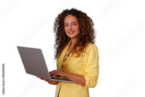 © Komora, Naklejka premium Professional woman smiling, working confidently on laptop. Portrait of a happy businesswoman with curly hair on transparent background