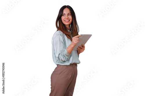 Fototapeta premium Professional woman standing, smiling and researching on digital tablet, using...