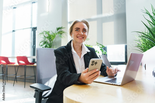 Obraz premium Professional woman working at a desk in modern office space, using laptop and smartphone
