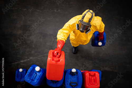 Obraz premium Professional worker in hazmat protection suit and gas mask working with...
