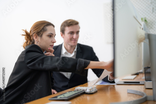 Obraz premium Professionals collaborating on project tasks at a modern workspace during daylight hours