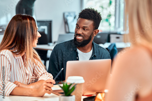 Fototapeta premium Professionals creating new project. Multiethnic business team using tablet at...