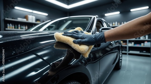 © anko, Obraz premium Professionelle Autoaufbereitung in einem Fachbetrieb: Nahaufnahme der Reinigung und Lackaufbereitung von einem Auto mit glänzender, schwarzer Lackierung