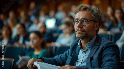 © Tomasz, Fototapeta premium Professor sitting at a desk in a lecture hall with an open book and notes, explaining the material