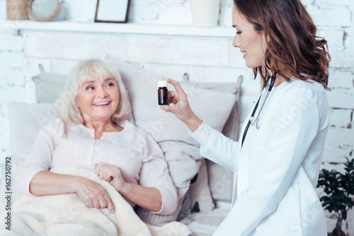 Fototapeta premium Proficient doctor offering medicament to aged patient in the hospital