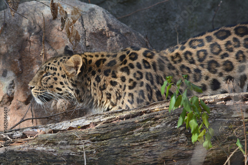 Obraz premium Profile Closeup Of A Female Amur Leopard Positioned Behind A Large Log