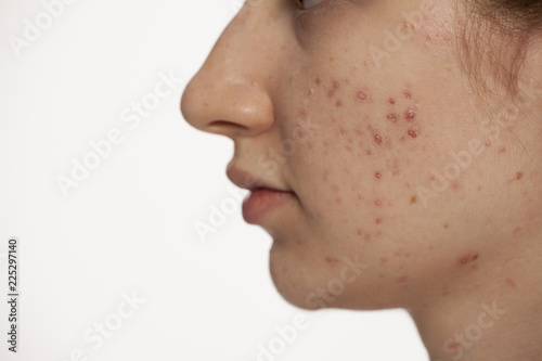 Obraz premium profile closeup of teenage girl with problematic skin on white background