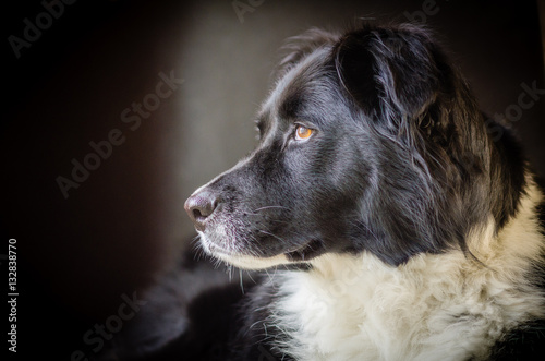 © Mary Lynn Strand, Fototapeta premium Profile of a black dog with white ruff with dark background.