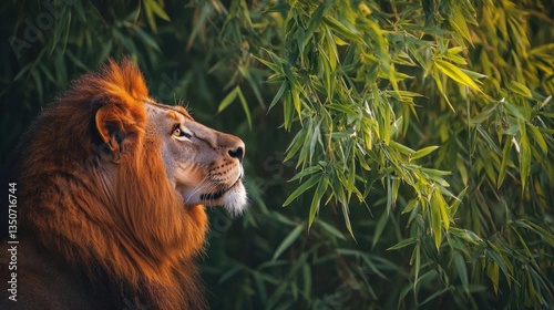 Naklejka premium Profile of a Majestic Lion Among Bamboo Forest Under Soft Sunlight in Natural...