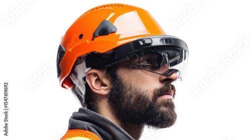 Fototapeta premium Profile of a man wearing orange safety helmet and glasses, focused and prepared for work.