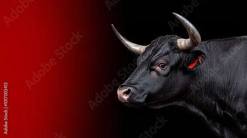 © Cadengo, Naklejka premium Profile of a spanish black Fighting Bull, full body. Red background
