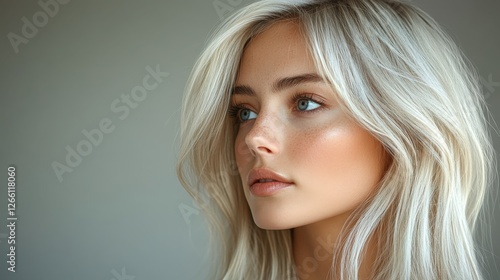 © Iurii, Fototapeta premium Profile of a woman with sleek platinum blonde hair on a light gray background