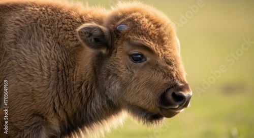© Siti, Fototapeta premium Profile of a young bison calf in a grassy field, eye level view
