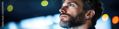 © Lila Patel, Fototapeta premium Profile of Bearded Man Against Blurred Background Lighting