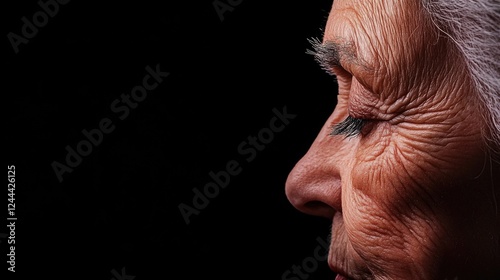 Fototapeta premium Profile of elderly female with wrinkled skin on black background