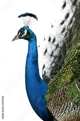 Obraz premium Profile of Male Indian Peafowl in front of white background