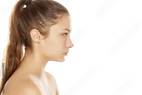 © vladimirfloyd, Naklejka premium profile of young girl without makeup on white background