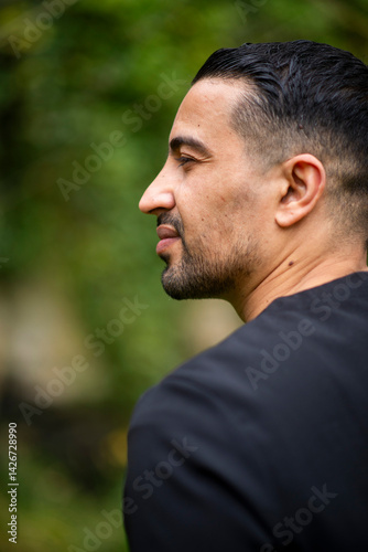 Obraz premium Profile of young hispanic male in outdoor setting with natural background