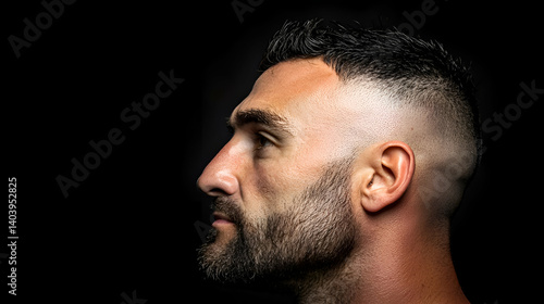 © Sujito, Obraz premium Profile Portrait of a Bearded Man Against a Dark Background