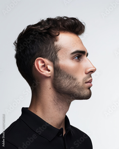 © Hamza, Fototapeta premium Profile portrait of a young man with short hair and beard against a light background