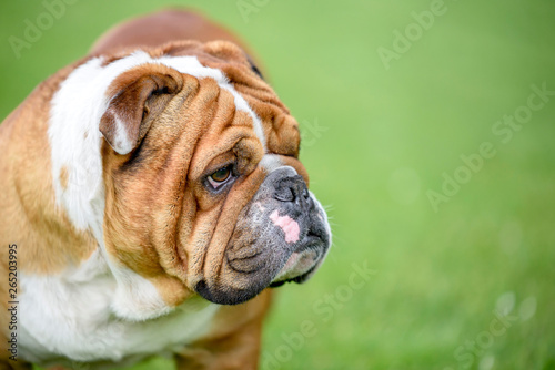 © ltummy, Fototapeta premium Profile portrait of beautiful English bulldog outdoor,selective focus and blank space