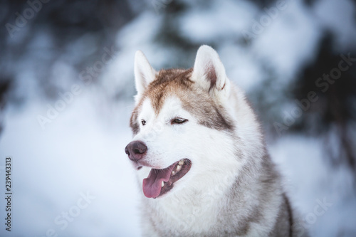 Naklejka premium Profile Portrait of prideful and happy Siberian Husky dog sitting on the snow in front of fir-tree in the winter forest