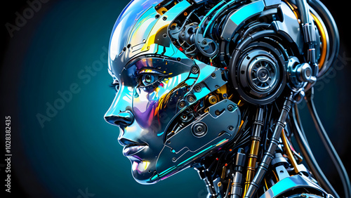 © Jim Middlewoods, Fototapeta premium Profile shot of beautiful android with female face. Colorful reflection on the face.