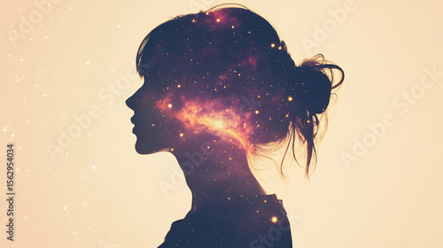 Fototapeta premium Profile silhouette of a woman filled with galaxy light illustrating cosmic...