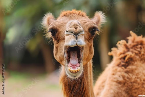 © StockUp, Obraz premium Profile view of a camel making a funny face and showing teeth in an outdoor environment, amid greenery.