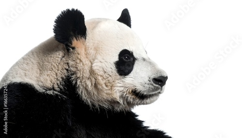 © art, Fototapeta premium Profile view of a majestic giant panda, showcasing its distinctive black and white fur pattern against a plain white background.