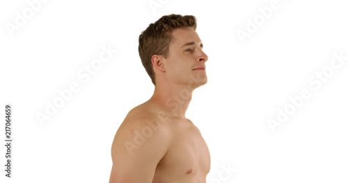 © Mark Adams, Fototapeta premium Profile view of handsome Caucasian male looking out at imaginary ocean in studio