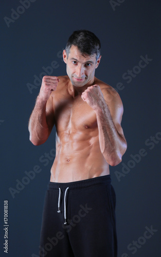 Fototapeta premium Profile view of young man practicing boxing .Personal instructor. Personal training.
