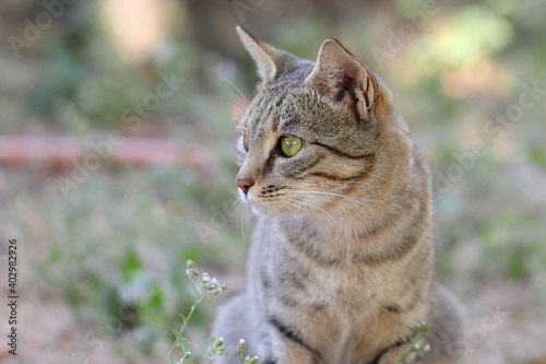 © Dinesh, Fototapeta premium Profile view photo of a cat sitting in the garden