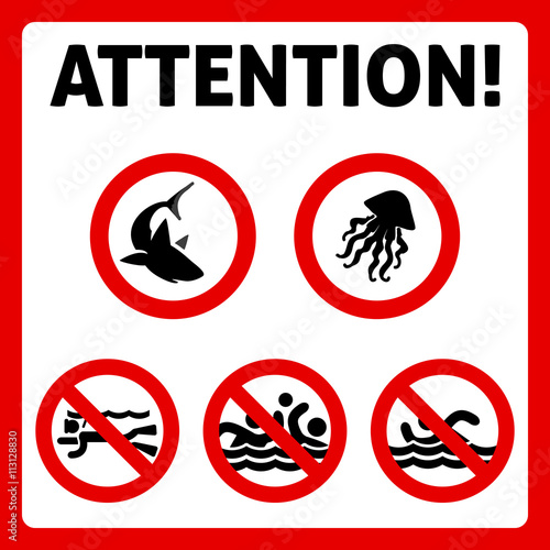 © vectortatu, Obraz premium Prohibition swimming sign with text. Attention swimming people shark and jellyfish signd. Vector illustration