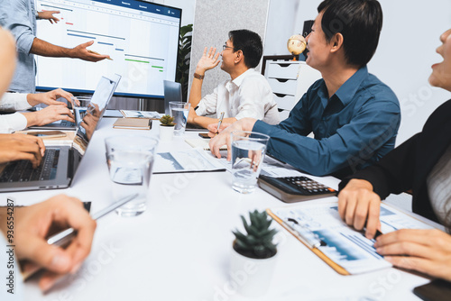 © InfiniteFlow, Obraz premium Project manager communicate and collaborate with team using project management software display on monitor, tracking progress of project task and making schedule plan at meeting table. Prudent
