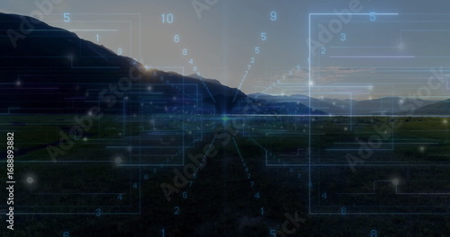 Obraz premium Projecting grid lines circuit paths with glowing numeric markers and central node over green valley