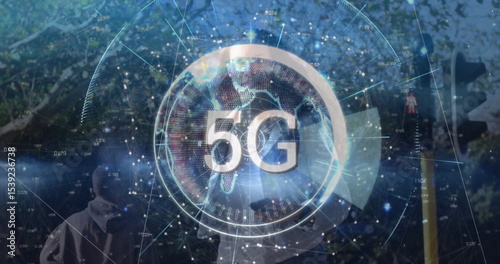 Fototapeta premium Projecting holographic 5G overlay over surveyor wearing hard hat and holding...
